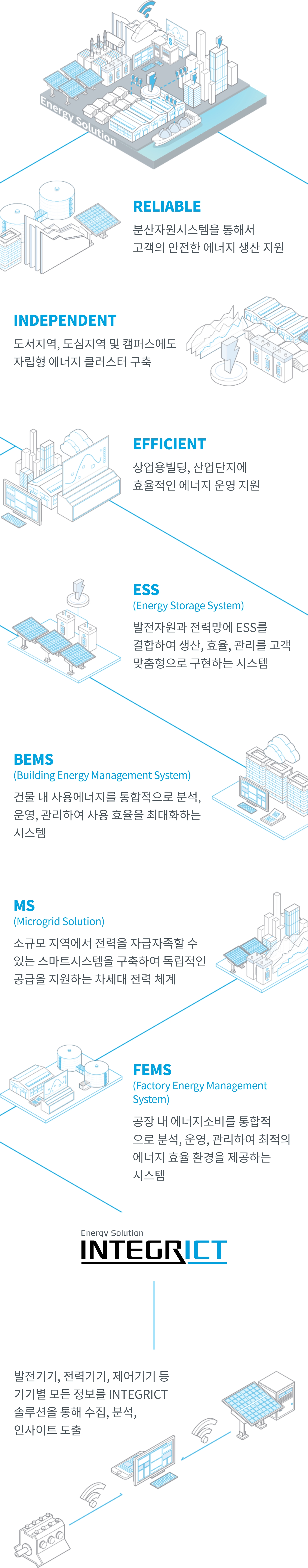 에너지 솔루션사업이란 전력 에너지의 생산, 소비, 판매, 운영을 통합 관리하여 전력에너지의 효율적인 사용을 가능하게 하는 시스템을 설계, 조달, 및 구축하는 사업을 의미합니다. 신재생에너지 등 다양한 에너지원의 등장과 전력산업 구조의 변화로 효율적인 에너지관리가 중요한 시대에 주목되는 사업분야 입니다.